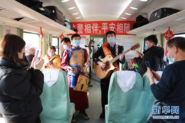 1月25日,包頭鐵路公安處民警(右)在列車上與旅客共同表演文藝節(jié)目。
