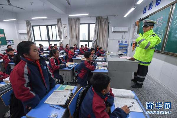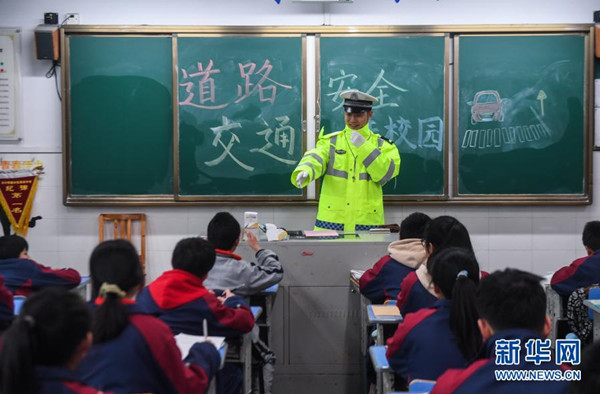 3月16日,湖州市交警支隊(duì)東林中隊(duì)的輔警給東林中學(xué)的學(xué)生上交通安全課。新華社記者 徐昱 攝