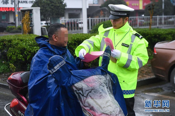 3月16日,湖州市交警支隊(duì)東林中隊(duì)的輔警在鎮(zhèn)區(qū)的十字路口勸誡非機(jī)動(dòng)車駕駛者,提醒戴安全帽并遵守交通規(guī)則。新華社記者 徐昱 攝