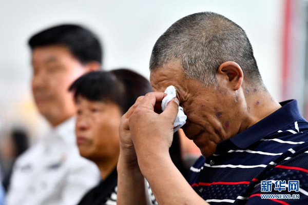 6月8日,在“認(rèn)親,我們?cè)谛袆?dòng)”濟(jì)南主會(huì)場(chǎng),吳某林在擦拭眼淚,他即將與被拐多年的兒子相認(rèn)。新華社記者 郭緒雷 攝