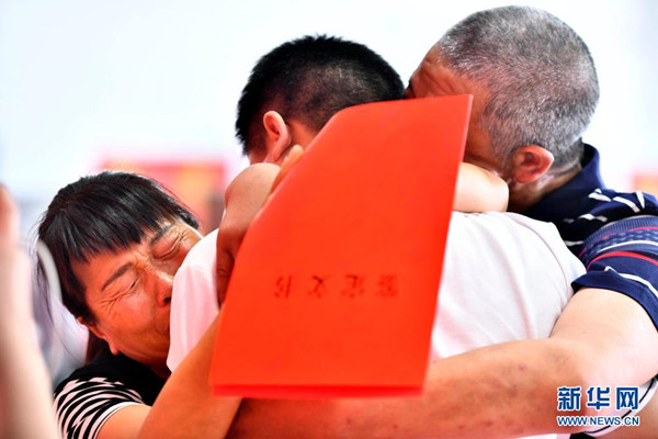 6月8日,在“認(rèn)親,我們?cè)谛袆?dòng)”濟(jì)南主會(huì)場(chǎng),張某(左)和吳某林(右)擁抱著被拐的兒子。新華社記者 郭緒雷 攝