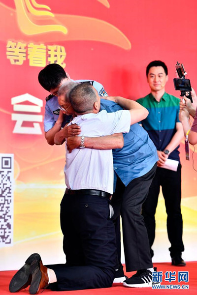 6月8日,在“認(rèn)親,我們?cè)谛袆?dòng)”濟(jì)南主會(huì)場(chǎng),被拐58年的羅亞軍跪擁著90歲高齡的父親羅鳳坤。新華社記者 郭緒雷 攝