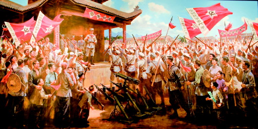 這是展示于龍州起義紀念館里的油畫。圖為1930年2月1日,龍州起義打響,1萬多名軍民在龍州縣城新填地廣場集會。(龍州起義紀念館供圖)