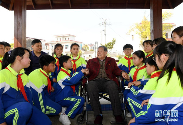 3月28日,馬毛姐回到家鄉(xiāng)安徽省無(wú)為市劉渡鎮(zhèn)馬壩村,給家鄉(xiāng)的學(xué)生們講述當(dāng)年的戰(zhàn)斗經(jīng)歷。新華社發(fā)(鄭遠(yuǎn) 攝)