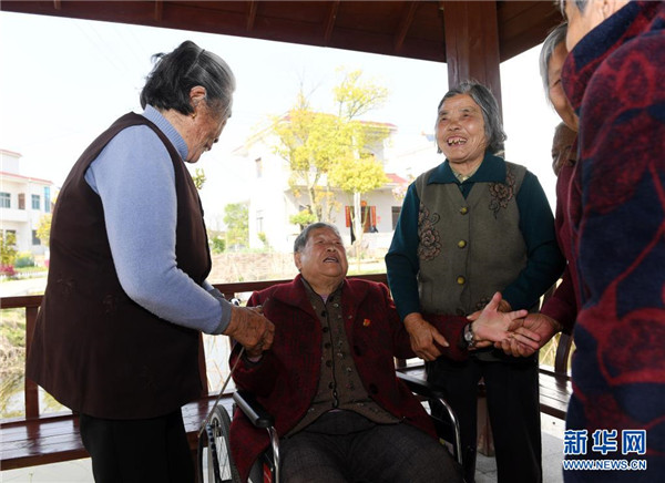 3月28日,馬毛姐回到家鄉(xiāng)安徽省無(wú)為市劉渡鎮(zhèn)馬壩村,與當(dāng)年的姐妹們?cè)捈页!P氯A社發(fā)(鄭遠(yuǎn) 攝)