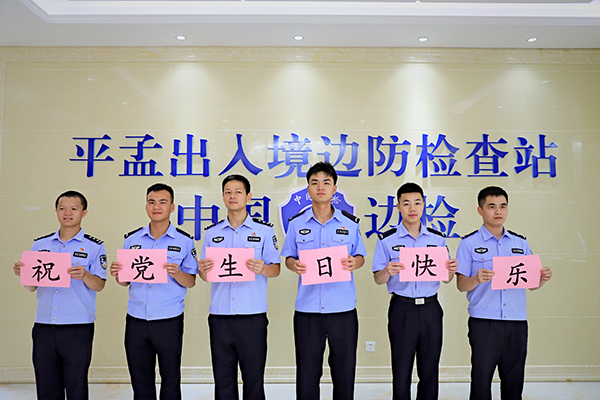 在平孟口岸樓前,民輔警職工整齊劃一擺出“100”的造型,深情回望黨的光輝歷程;在邊境界碑前,民輔警舉起右拳,向著黨旗,重溫入黨誓詞,立志傳承黨的紅色基因;在站機關(guān)樓前,民輔警手舉“熱烈慶祝中國共產(chǎn)黨成立100周年“橫幅,手搖小黨旗,洋溢著笑容,衷心祝福黨的光明前景;在辦公樓里,民輔警拿著“祝黨生日快樂”,“不忘初心 牢記使命”卡片,述說對黨的無限忠誠。