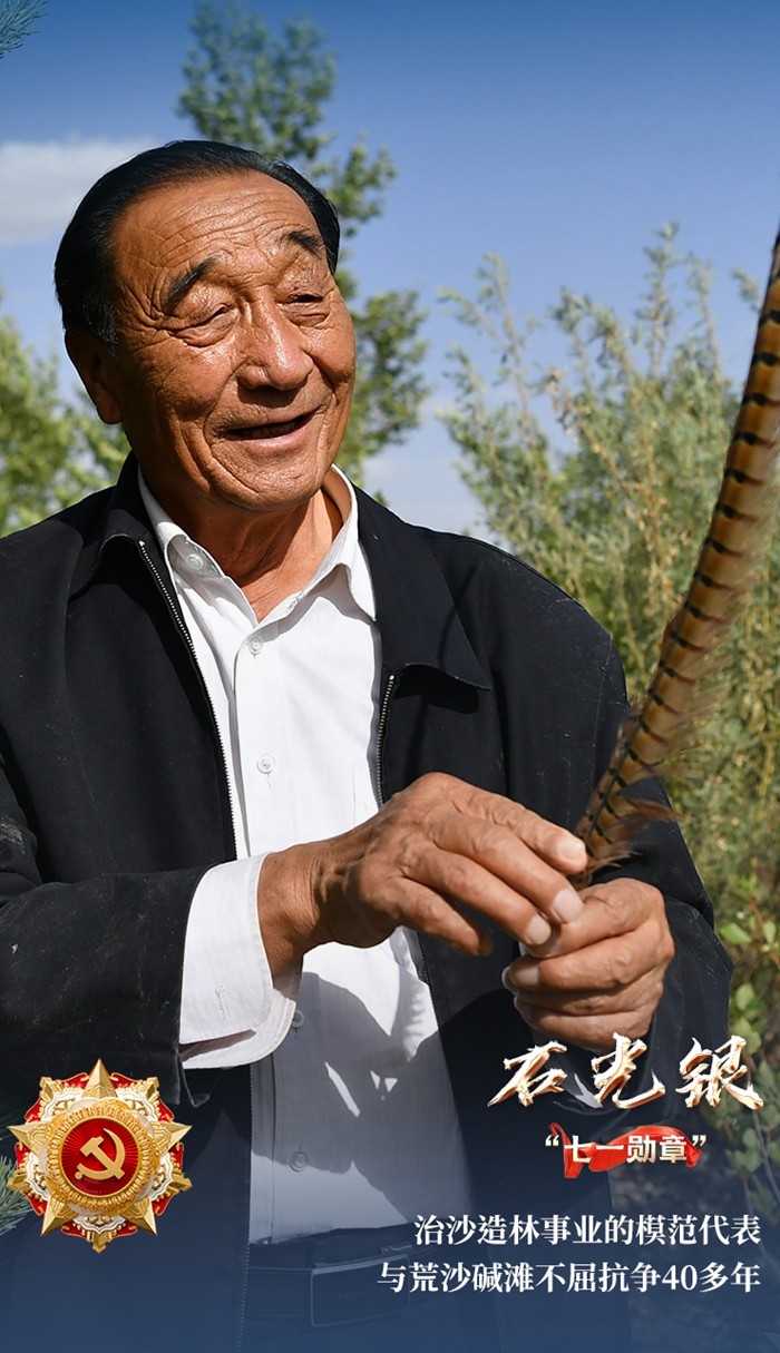 “石光銀,治沙造林事業(yè)的模范代表,40多年堅(jiān)持與荒沙堿灘不屈抗?fàn)帲瑒?chuàng)造治沙與致富相結(jié)合的新模式,為徹底改變毛烏素沙漠南緣‘沙進(jìn)人退’惡劣環(huán)境作出杰出貢獻(xiàn)?!边@簡短的出場(chǎng)介紹,讓更多的人記住了這副寬厚的肩膀扛起來的不凡事業(yè),也為“治沙人”的故事寫下梗概。