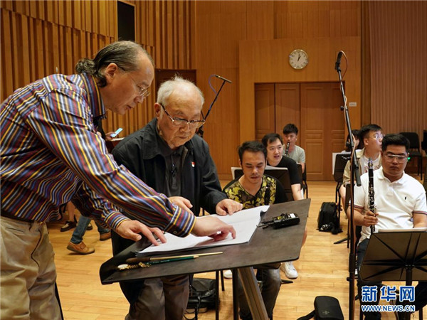 6月9日,呂其明(左二)在上海愛樂樂團錄制管樂版《紅旗頌》的現(xiàn)場,與指揮林友聲討論樂譜。新華社記者 劉穎 攝