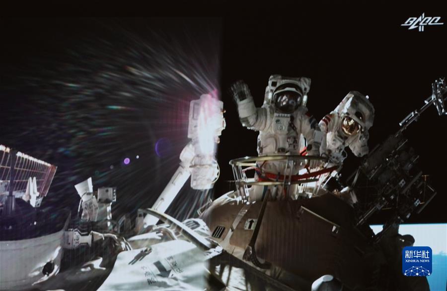 8月20日在北京航天飛行控制中心大屏拍攝的神舟十二號(hào)乘組航天員聶海勝、劉伯明在出艙任務(wù)結(jié)束后揮手示意。新華社記者 田定宇 攝