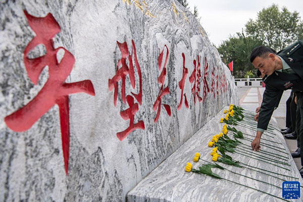 2020年9月25日,在位于山西省大同市靈丘縣的平型關(guān)大捷紀念館,工作人員向革命先烈獻花。新華社記者 楊晨光 攝