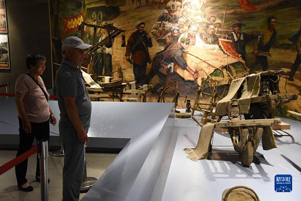 在位于山東省臨沂市蒙陰縣的孟良崮戰(zhàn)役紀念館,游客參觀孟良崮戰(zhàn)役期間使用過的小推車(2019年6月9日攝)。新華社記者 王凱 攝