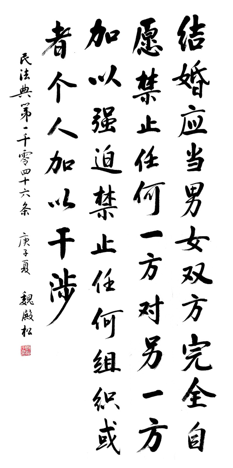 民法典第一千零四十六條 結(jié)婚應(yīng)當(dāng)男女雙方完全自愿,禁止任何一方對另一方加以強(qiáng)迫,禁止任何組織或者個人加以干涉。