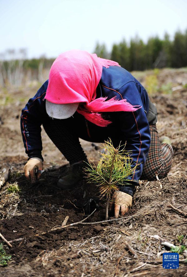 塞罕壩機(jī)械林場工人在石質(zhì)陽坡上造林(2016年4月13日攝)。新華社發(fā)