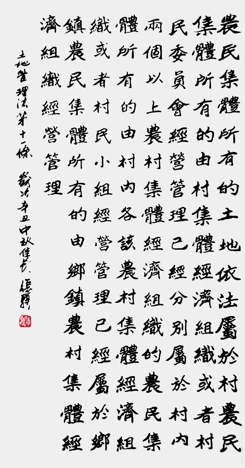 繼1600余位書法家參與書寫《中華人民共和國民法典》全部1260條法條之后,法治日?qǐng)?bào)社聯(lián)合自然資源部法規(guī)司、自然資源部書畫研究會(huì)和北京昌平書法家協(xié)會(huì),將筆端對(duì)準(zhǔn)土地管理“一法一條例”,即《中華人民共和國土地管理法》和《中華人民共和國土地管理法實(shí)施條例》。