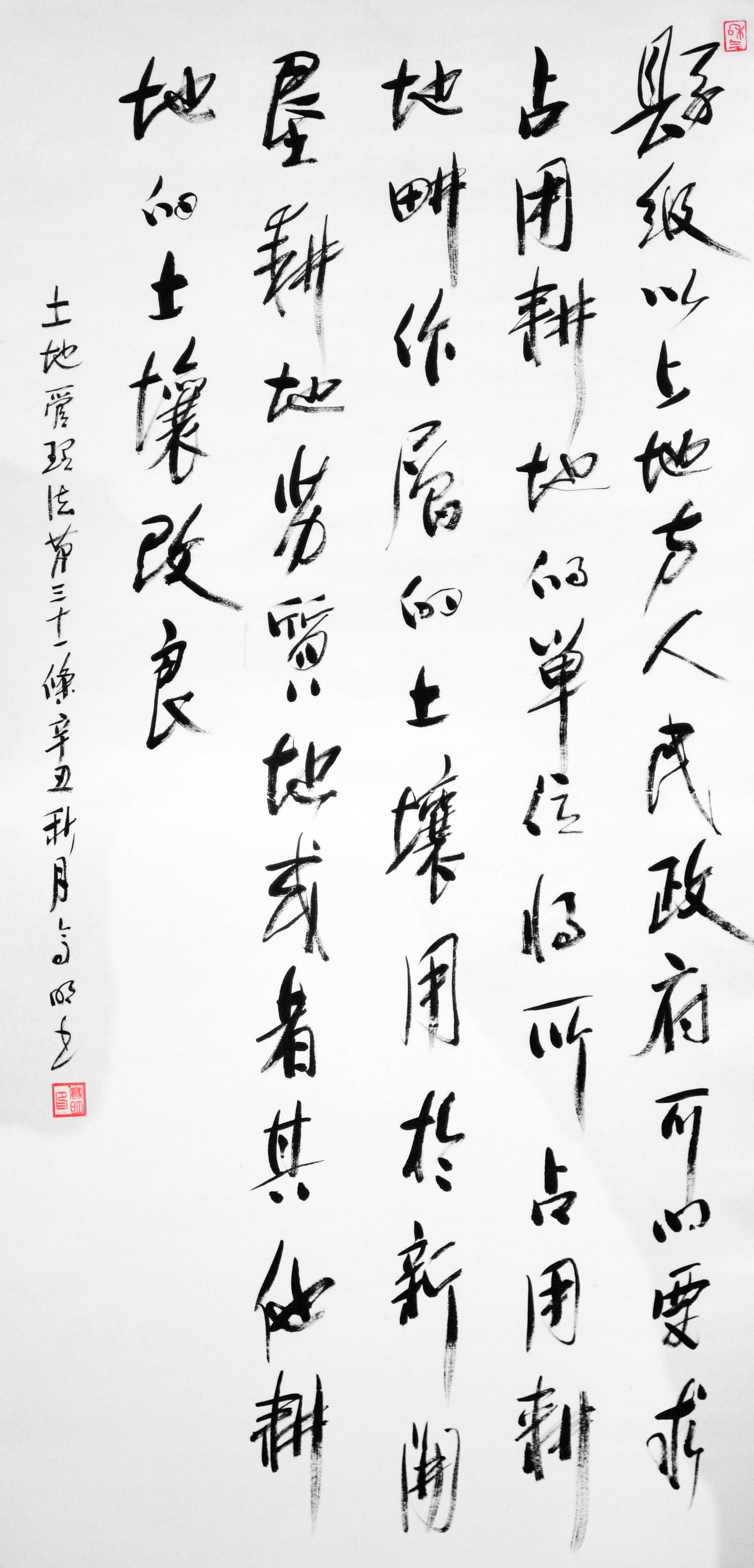 繼1600余位書法家參與書寫《中華人民共和國民法典》全部1260條法條之后,法治日報(bào)社聯(lián)合自然資源部法規(guī)司、自然資源部書畫研究會和北京昌平書法家協(xié)會,將筆端對準(zhǔn)土地管理“一法一條例”,即《中華人民共和國土地管理法》和《中華人民共和國土地管理法實(shí)施條例》。