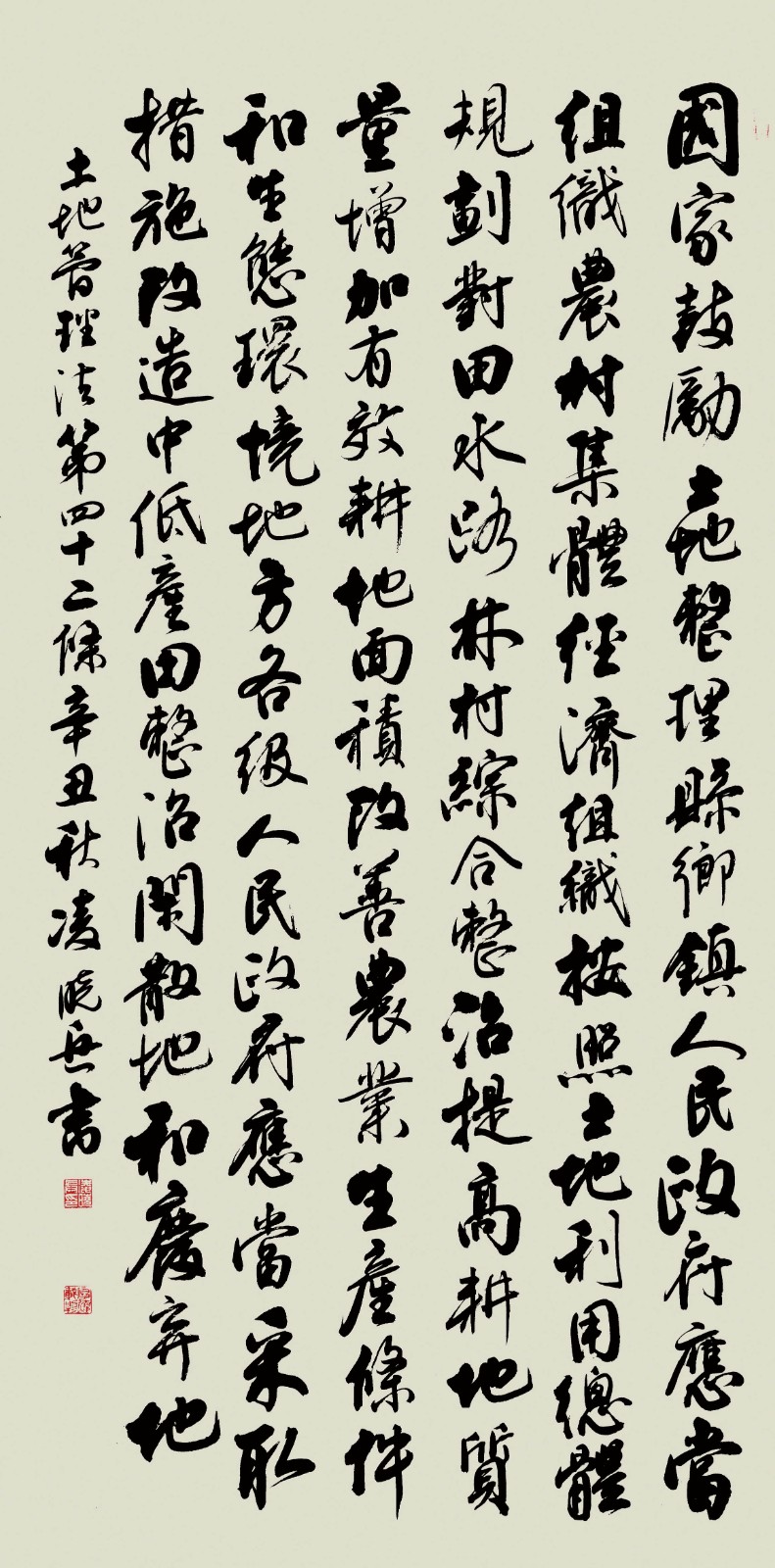 繼1600余位書法家參與書寫《中華人民共和國民法典》全部1260條法條之后,法治日報社聯(lián)合自然資源部法規(guī)司、自然資源部書畫研究會和北京昌平書法家協(xié)會,將筆端對準(zhǔn)土地管理“一法一條例”,即《中華人民共和國土地管理法》和《中華人民共和國土地管理法實(shí)施條例》。