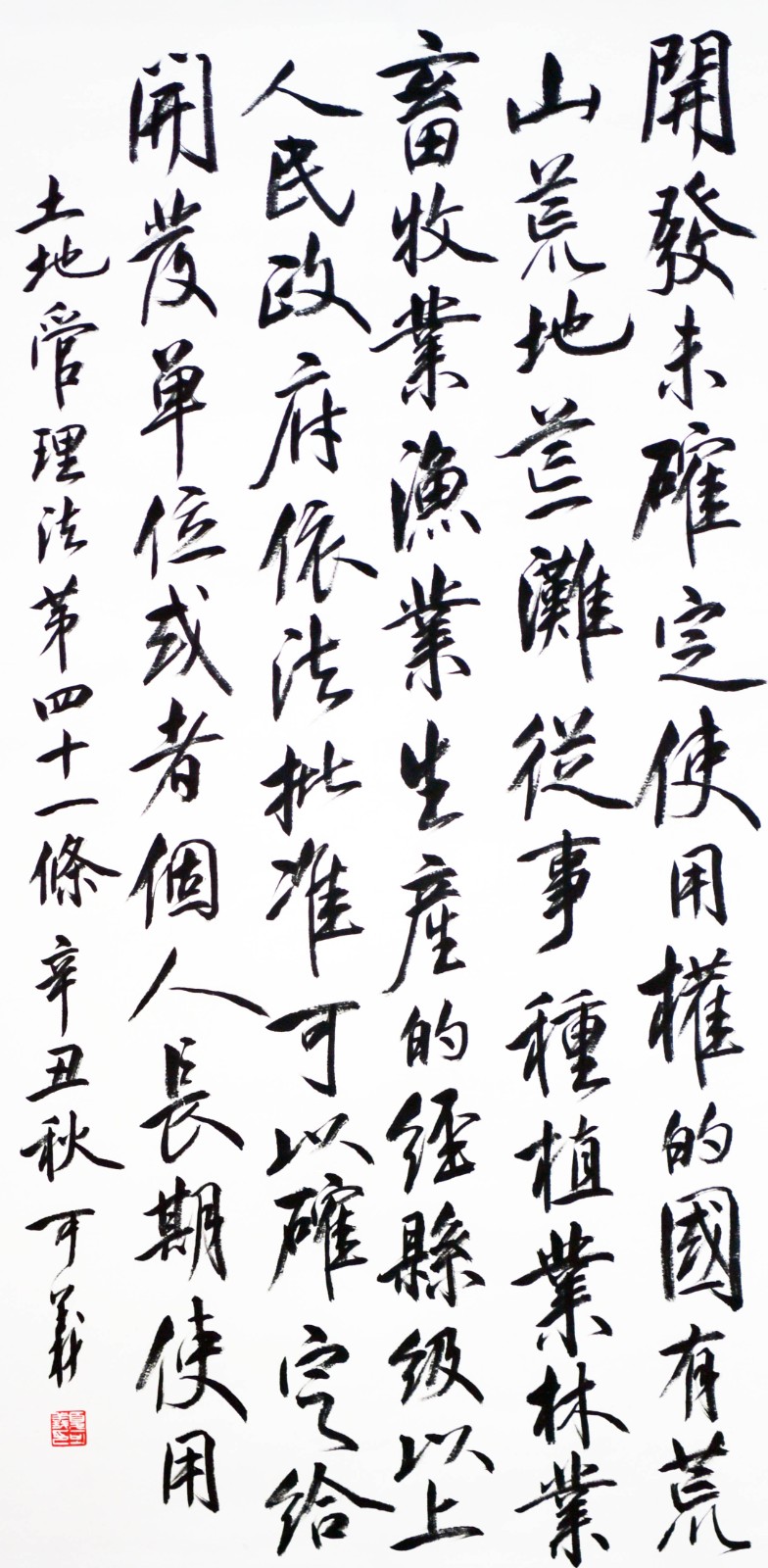 繼1600余位書法家參與書寫《中華人民共和國民法典》全部1260條法條之后,法治日報社聯(lián)合自然資源部法規(guī)司、自然資源部書畫研究會和北京昌平書法家協(xié)會,將筆端對準(zhǔn)土地管理“一法一條例”,即《中華人民共和國土地管理法》和《中華人民共和國土地管理法實施條例》。
