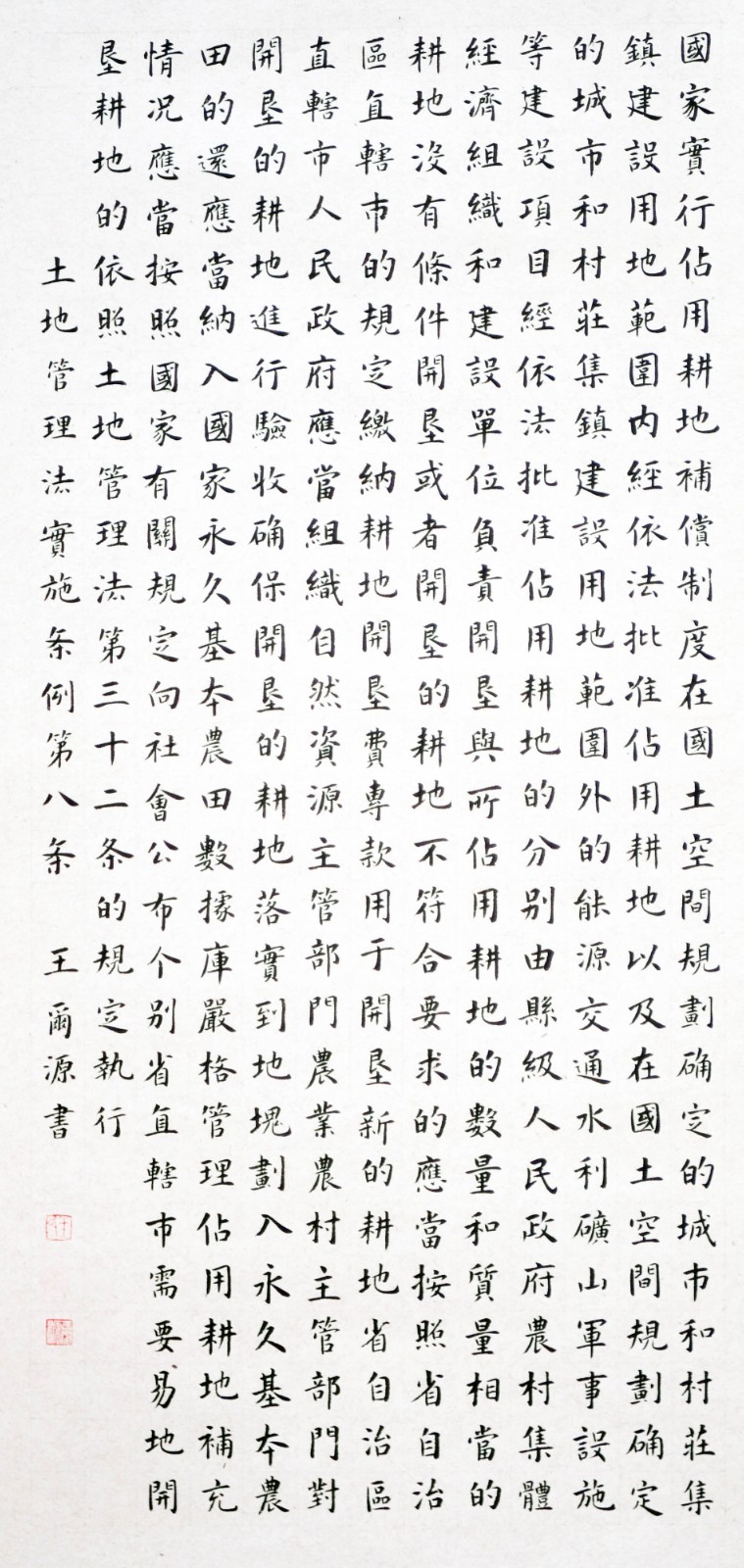 繼1600余位書法家參與書寫《中華人民共和國民法典》全部1260條法條之后,法治日報社聯(lián)合自然資源部法規(guī)司、自然資源部書畫研究會和北京昌平書法家協(xié)會,將筆端對準土地管理“一法一條例”,即《中華人民共和國土地管理法》和《中華人民共和國土地管理法實施條例》。