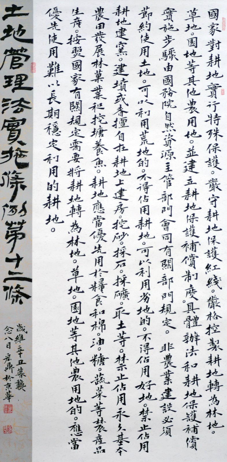 繼1600余位書法家參與書寫《中華人民共和國民法典》全部1260條法條之后,法治日報(bào)社聯(lián)合自然資源部法規(guī)司、自然資源部書畫研究會(huì)和北京昌平書法家協(xié)會(huì),將筆端對(duì)準(zhǔn)土地管理“一法一條例”,即《中華人民共和國土地管理法》和《中華人民共和國土地管理法實(shí)施條例》。