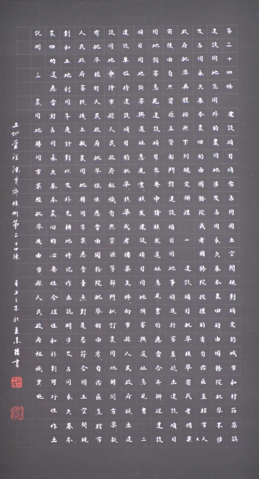 繼1600余位書法家參與書寫《中華人民共和國民法典》全部1260條法條之后,法治日報(bào)社聯(lián)合自然資源部法規(guī)司、自然資源部書畫研究會和北京昌平書法家協(xié)會,將筆端對準(zhǔn)土地管理“一法一條例”,即《中華人民共和國土地管理法》和《中華人民共和國土地管理法實(shí)施條例》。