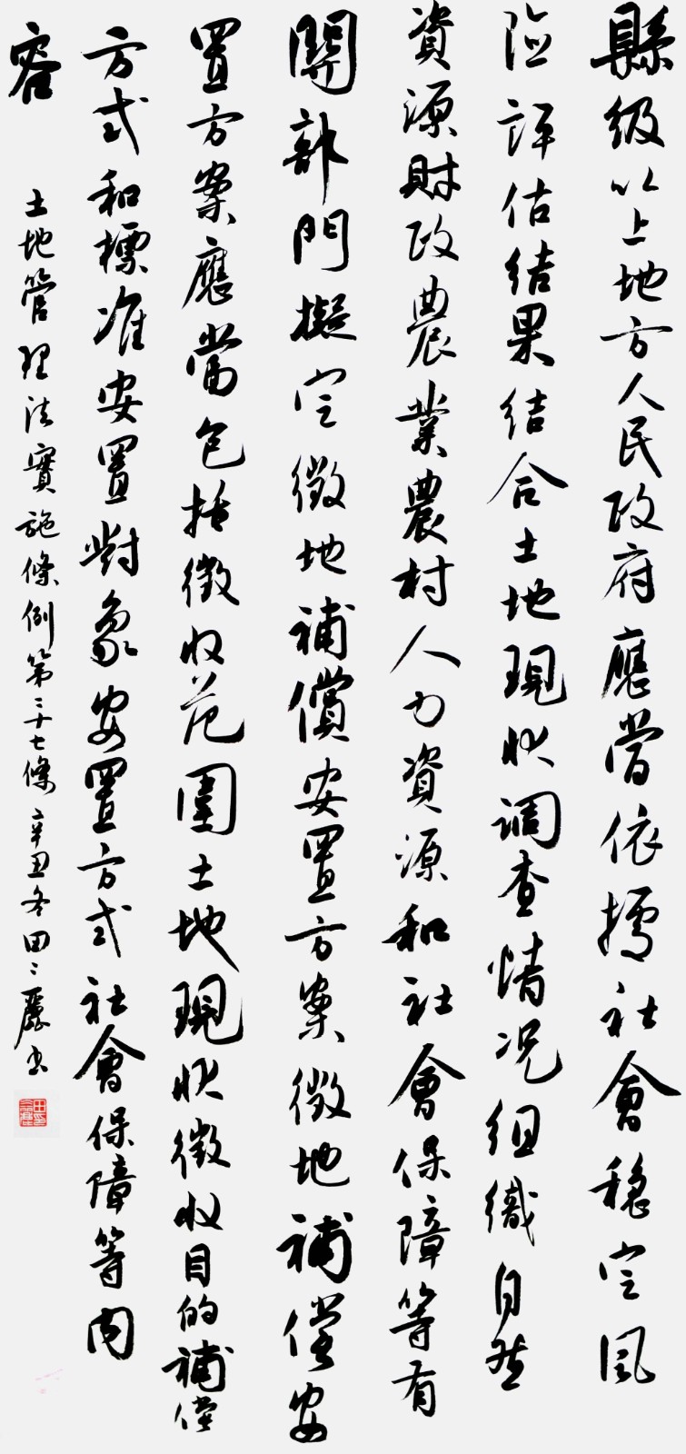 繼1600余位書法家參與書寫《中華人民共和國民法典》全部1260條法條之后,法治日報社聯(lián)合自然資源部法規(guī)司、自然資源部書畫研究會和北京昌平書法家協(xié)會,將筆端對準(zhǔn)土地管理“一法一條例”,即《中華人民共和國土地管理法》和《中華人民共和國土地管理法實施條例》。