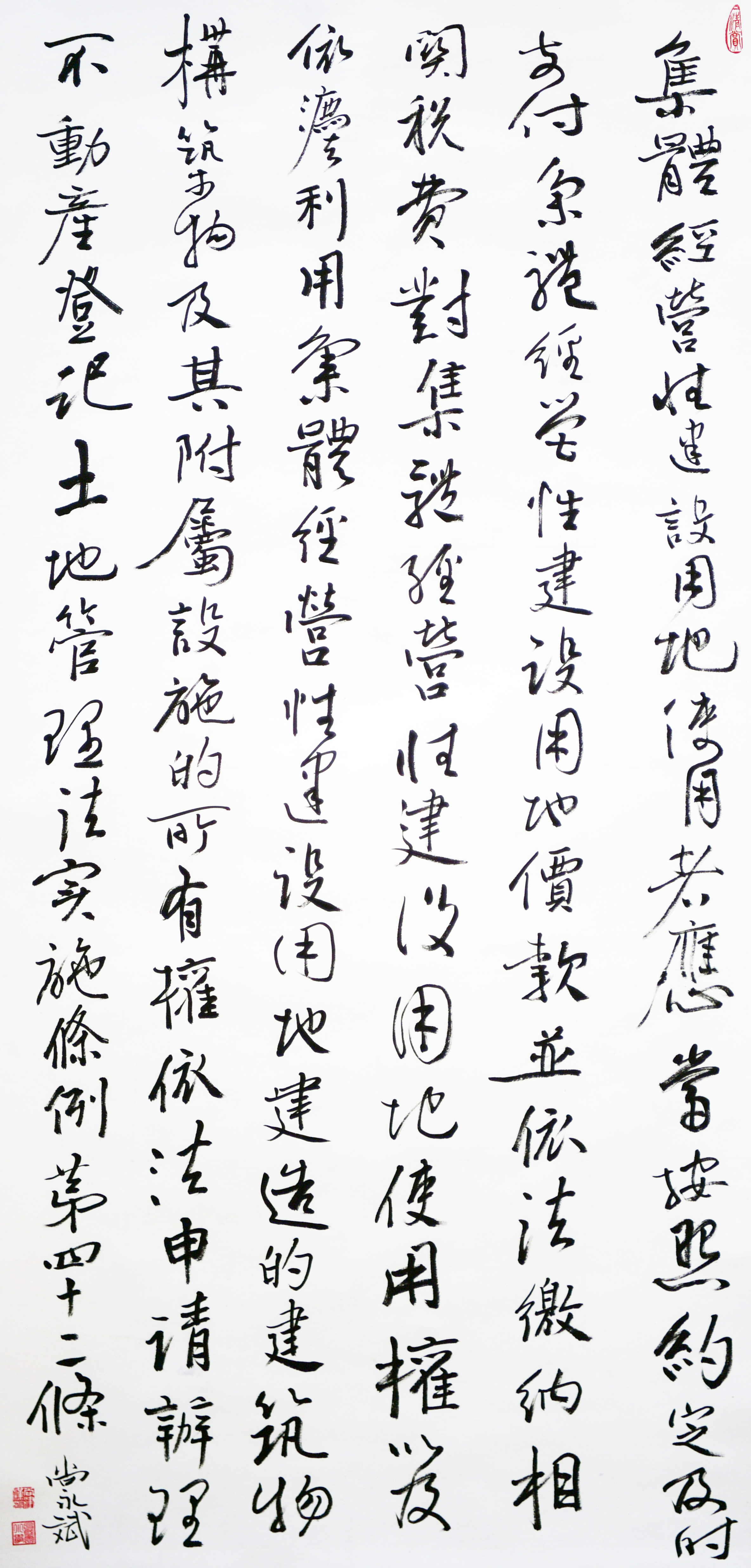 繼1600余位書法家參與書寫《中華人民共和國(guó)民法典》全部1260條法條之后,法治日?qǐng)?bào)社聯(lián)合自然資源部法規(guī)司、自然資源部書畫研究會(huì)和北京昌平書法家協(xié)會(huì),將筆端對(duì)準(zhǔn)土地管理“一法一條例”,即《中華人民共和國(guó)土地管理法》和《中華人民共和國(guó)土地管理法實(shí)施條例》。