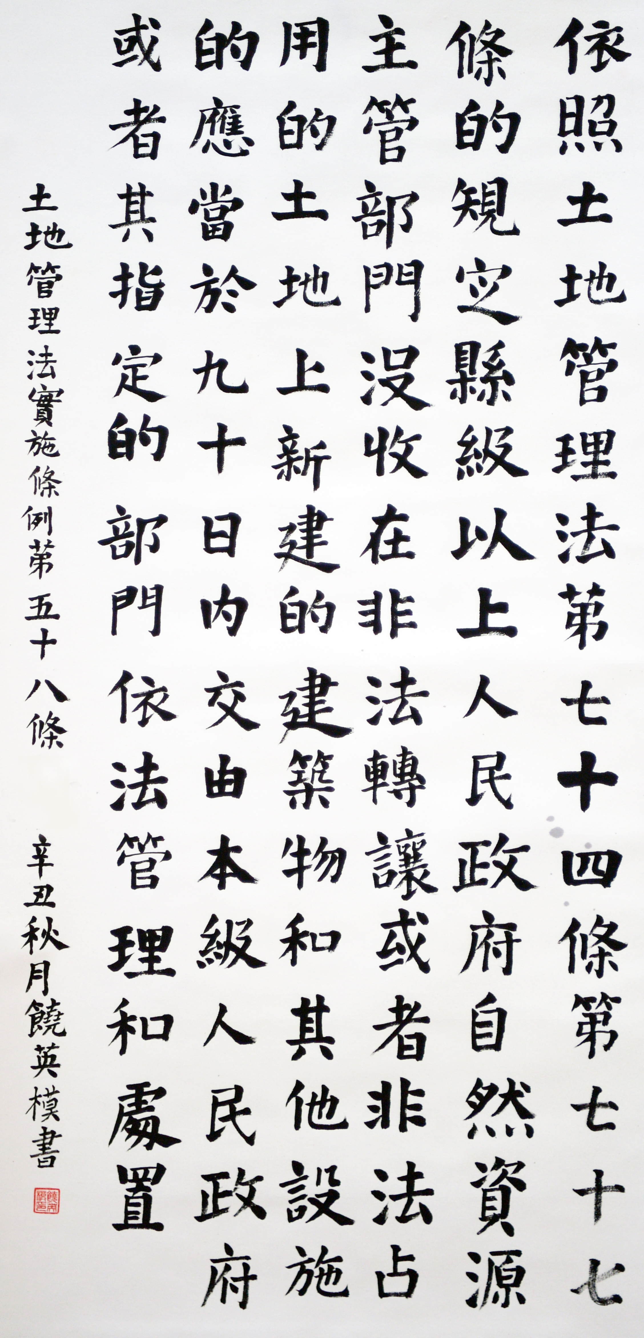 繼1600余位書法家參與書寫《中華人民共和國民法典》全部1260條法條之后,法治日報社聯(lián)合自然資源部法規(guī)司、自然資源部書畫研究會和北京昌平書法家協(xié)會,將筆端對準(zhǔn)土地管理“一法一條例”,即《中華人民共和國土地管理法》和《中華人民共和國土地管理法實(shí)施條例》。