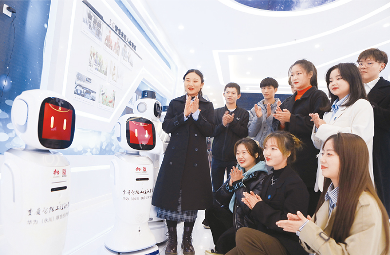 2021年11月13日,重慶智能工程職業(yè)學(xué)院校園內(nèi),智能機(jī)器人“大華”、“大智”向?qū)W生們普及黨的十九屆六中全會(huì)精神,其可愛的形象和聲音,深受學(xué)生們的喜愛。 人民圖片 陳仕川/攝