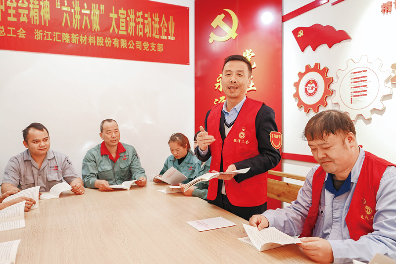 浙江省湖州市德清縣總工會(huì)組織由車間政委、勞動(dòng)模范、浙江工匠等組成的“典型模范宣講團(tuán)”走進(jìn)企業(yè)宣講黨的十九屆六中全會(huì)精神。圖為2021年11月30日,宣講團(tuán)成員在浙江匯隆新材料股份有限公司的紅色車間為職工宣講全會(huì)精神。 人民圖片 姚海翔/攝