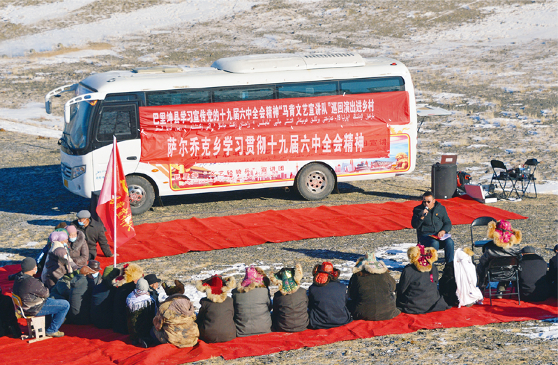 新疆巴里坤哈薩克自治縣組建“馬背文藝宣講隊(duì)”,深入邊遠(yuǎn)農(nóng)牧區(qū)鄉(xiāng)村開展黨的十九屆六中全會(huì)精神巡回宣講。圖為2021年12月1日,宣講隊(duì)給冬牧場的哈薩克族牧民宣講全會(huì)精神。 人民圖片 張建剛/攝
