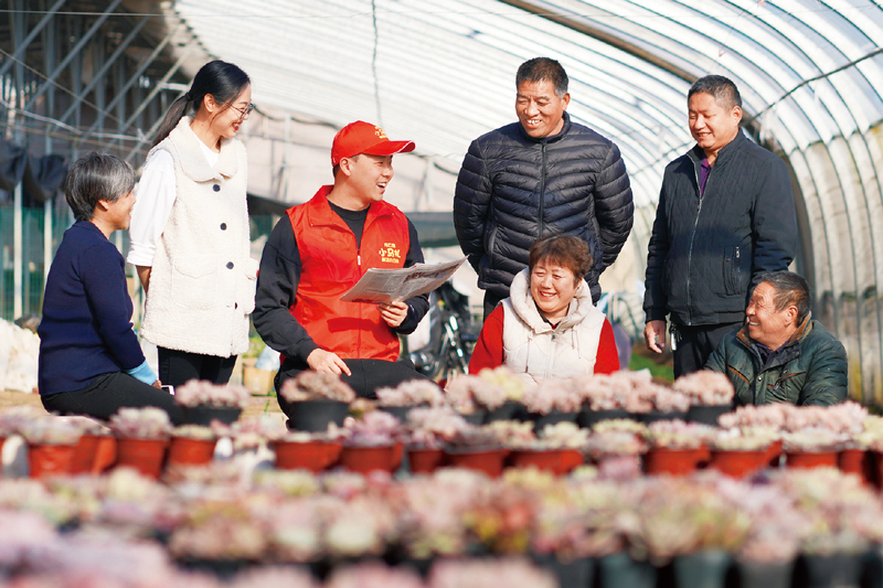 河北省邢臺(tái)市內(nèi)丘縣組織六十二支“小馬扎”宣講小分隊(duì)深入到社區(qū)、學(xué)校、農(nóng)村和企業(yè),利用快板、詩歌、說唱等群眾喜聞樂見的形式開展宣講活動(dòng),把黨的十九屆六中全會(huì)精神送到群眾家門口。圖為2021年11月23日,“小馬扎”宣講小分隊(duì)隊(duì)員在馬澗村花卉大棚宣講全會(huì)精神。 人民圖片 劉繼東/攝