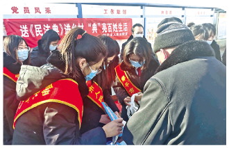 圖為鄒平法院干警在西言禮村向村民發(fā)放民法典知識手冊。