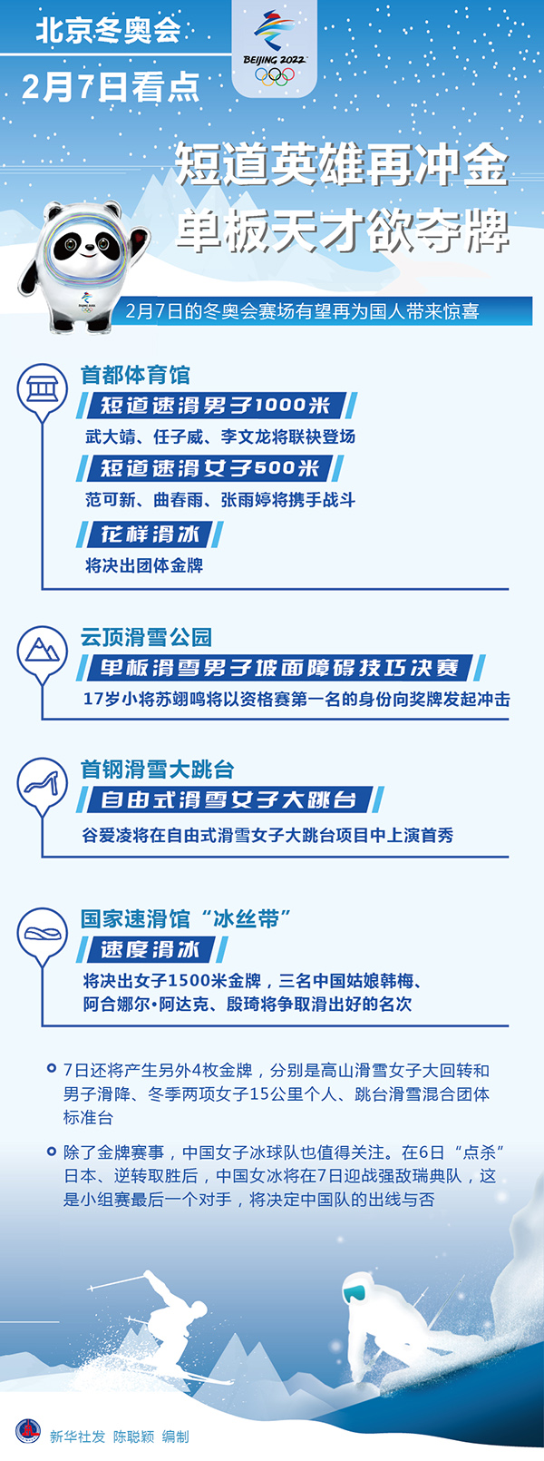 新華社北京2月6日電(記者張澤偉 王恒志)7日的冬奧會(huì)賽場(chǎng)有望再為國(guó)人帶來(lái)驚喜。為中國(guó)代表團(tuán)摘得首金的武大靖、任子威、范可新、曲春雨將再登冰場(chǎng),沖擊短道速滑男子1000米和女子500米金牌。以資格賽頭名晉級(jí)的中國(guó)單板滑雪小將蘇翊鳴,將拿出更難的動(dòng)作沖擊男子坡面障礙技巧獎(jiǎng)牌,書寫中國(guó)雪上項(xiàng)目新的歷史。谷愛(ài)凌則將在自由式滑雪大跳臺(tái)項(xiàng)目中上演冬奧首秀。