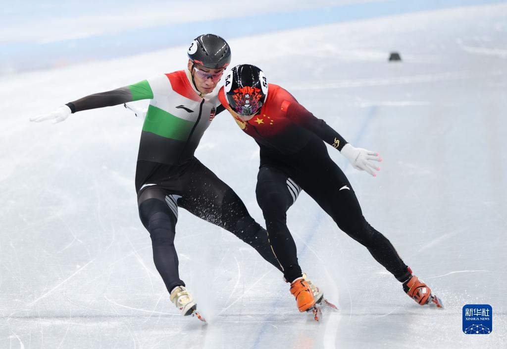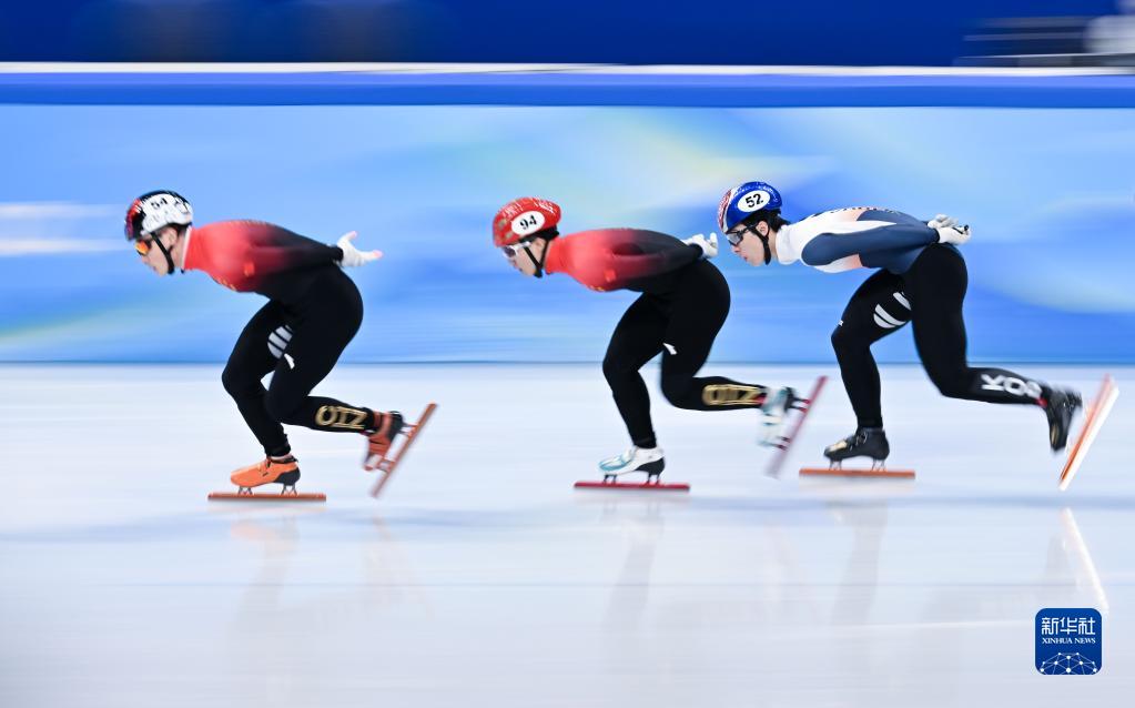 2月7日,中國選手任子威(左)、李文龍(中),韓國選手黃大憲(右)在比賽中。新華社記者李尕?cái)z