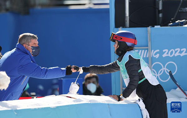 2月8日,國(guó)際奧委會(huì)主席巴赫(左)向中國(guó)選手谷愛(ài)凌表達(dá)祝賀。
