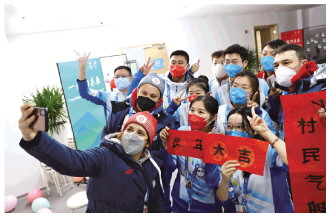 春節(jié)期間,北京冬奧會(huì)延慶賽區(qū)冬奧村里張燈結(jié)彩,志愿者和各代表團(tuán)成員相聚一堂,慶祝歡樂(lè)祥和的春節(jié)。圖為塞爾維亞代表團(tuán)成員和志愿者在延慶冬奧村合影留念。新華社發(fā) 肖紹雯 攝