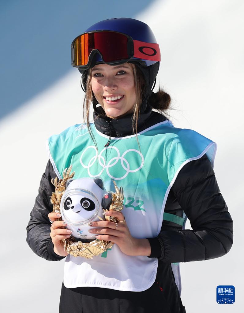 2月8日,自由式滑雪女子大跳臺(tái)比賽冠軍、中國(guó)選手谷愛凌在頒發(fā)紀(jì)念品儀式上。新華社記者 丁旭 攝