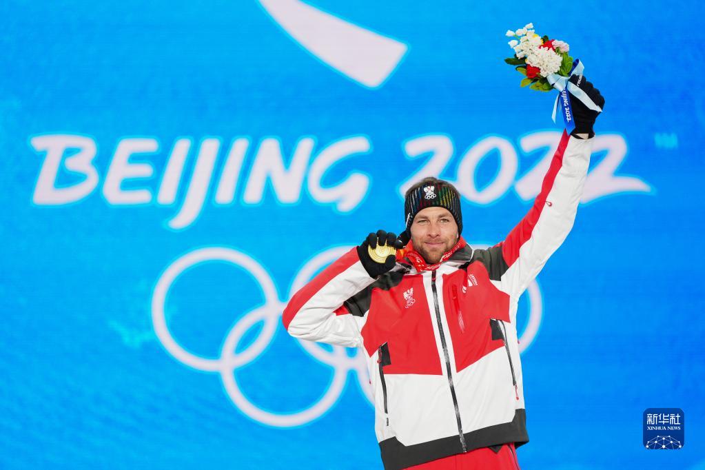 2月8日,單板滑雪男子平行大回轉(zhuǎn)比賽冠軍、奧地利選手本亞明·卡爾在獎(jiǎng)牌頒發(fā)儀式上。新華社記者 朱崢 攝