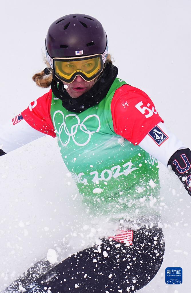 2月12日,美國(guó)選手琳賽·雅各貝利斯在比賽中。美國(guó)選手尼克·鮑姆加特納和琳賽·雅各貝利斯組成的美國(guó)一隊(duì)獲得單板滑雪障礙追逐混合團(tuán)體比賽的冠軍。新華社記者 許暢 攝