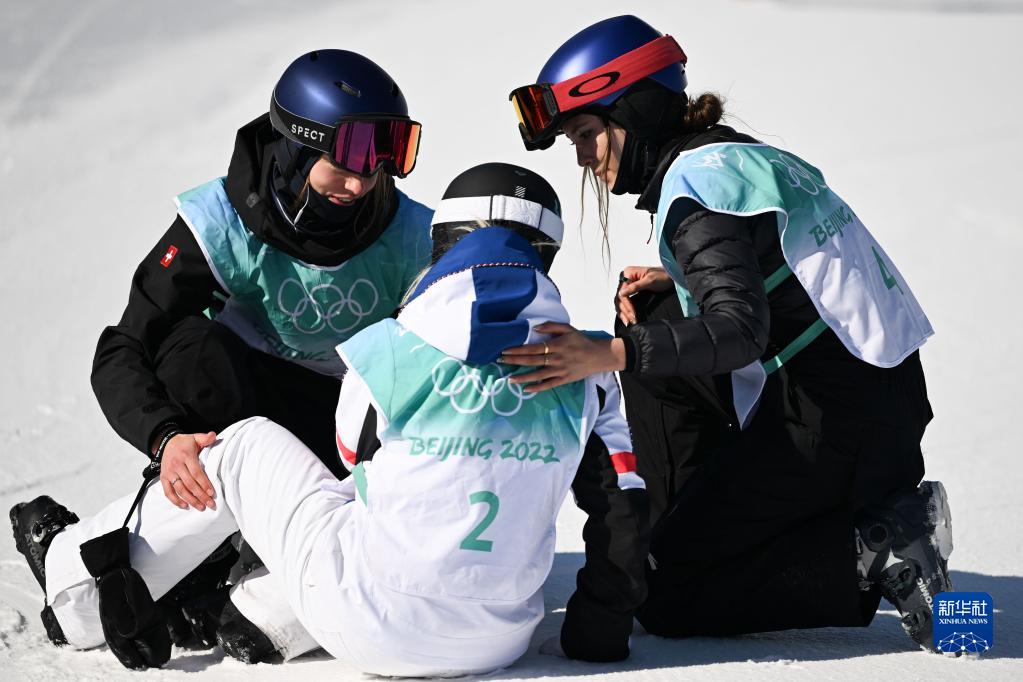2月8日,中國(guó)選手谷愛凌(右)和瑞士選手瑪?shù)贍柕隆じ窭啄拢ㄗ螅┰谧杂墒交┡哟筇_(tái)決賽后安慰法國(guó)選手泰絲·勒德。新華社記者 薛宇舸 攝