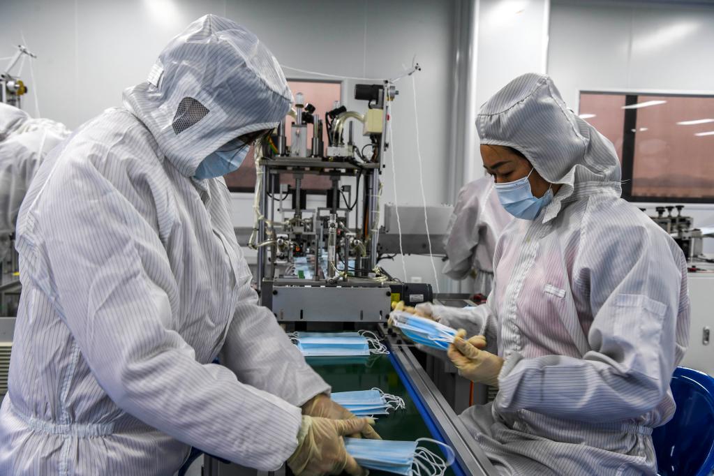 2022年2月18日,在廣西百色市一家口罩生產(chǎn)企業(yè)內(nèi),工作人員在生產(chǎn)線上忙碌。自2月15日零時起,廣西百色市部分縣(市、區(qū))解除“不進(jìn)不出”管控措施,當(dāng)?shù)卣行驈?fù)工復(fù)產(chǎn)。(新華社記者曹祎銘 攝)