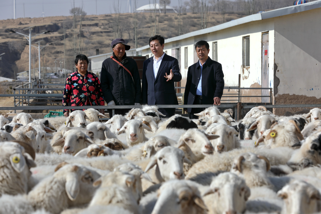 張宏祥(右二)在了解羊的養(yǎng)殖情況。新華社記者 原勛 攝