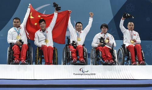 2018年3月17日,中國隊(duì)在平昌冬殘奧會輪椅冰壺比賽中獲得金牌。圖為隊(duì)員王海濤、陳建新、劉微、王蒙、張強(qiáng)(從左至右)在頒獎(jiǎng)儀式上。新華社記者夏一方攝