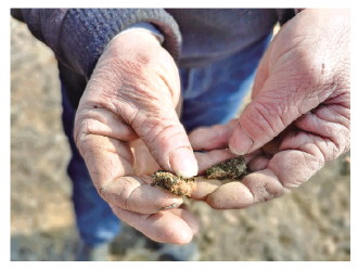 郭建軍從地上撿起一塊幾十年才形成的腐殖質(zhì)和土壤碳化層。 盧偉 攝
