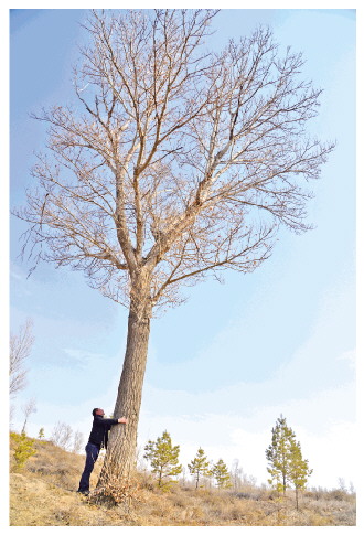 郭建軍環(huán)抱著林場(chǎng)里第一株成活的大樹。 白凌燕 攝