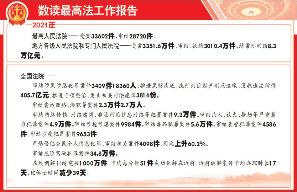 過(guò)去一年,司法前行的印記更加清晰,法治中國(guó)的腳步更加堅(jiān)毅,報(bào)告中的一個(gè)個(gè)案例,傳遞了鮮明的價(jià)值導(dǎo)向,讓法律條文走進(jìn)千家萬(wàn)戶。報(bào)告中的一串串?dāng)?shù)據(jù),勾勒出平安中國(guó)、法治中國(guó)建設(shè)新成效:2021年,最高人民法院受理案件33602件,審結(jié)28720件,制定司法解釋24件,發(fā)布指導(dǎo)性案例31個(gè);地方各級(jí)人民法院和專門人民法院受理案件3351.6萬(wàn)件,審結(jié)、執(zhí)結(jié)3010.4萬(wàn)件,結(jié)案標(biāo)的額8.3萬(wàn)億元,助推實(shí)現(xiàn)國(guó)家安全、社會(huì)安定、人民安寧。
