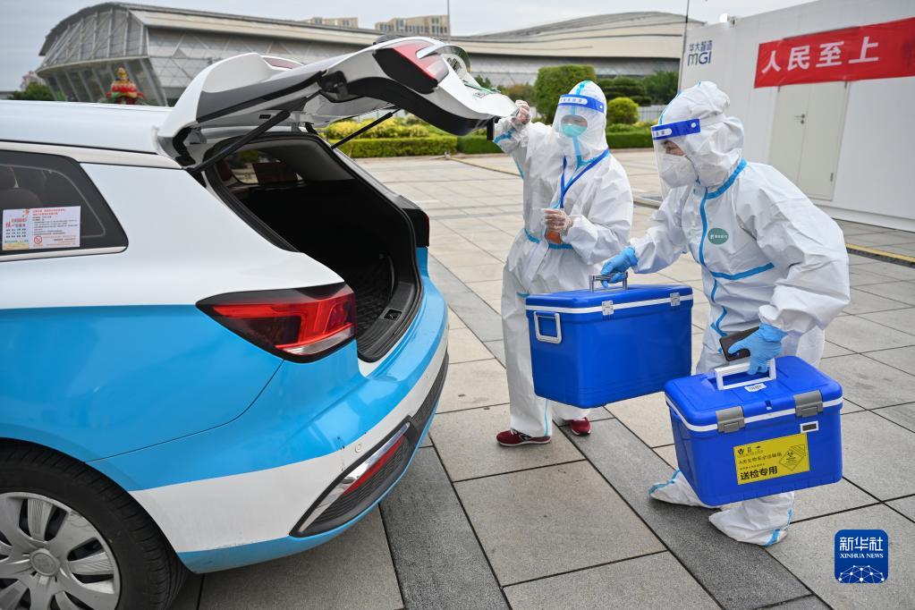 3月24日,在福建泉州市海峽體育中心聯合方艙核酸檢測基地,參加“抗疫志愿車隊”的出租車司機(左)協助醫(yī)務人員裝運核酸檢測樣本。新華社發(fā)(周義攝)