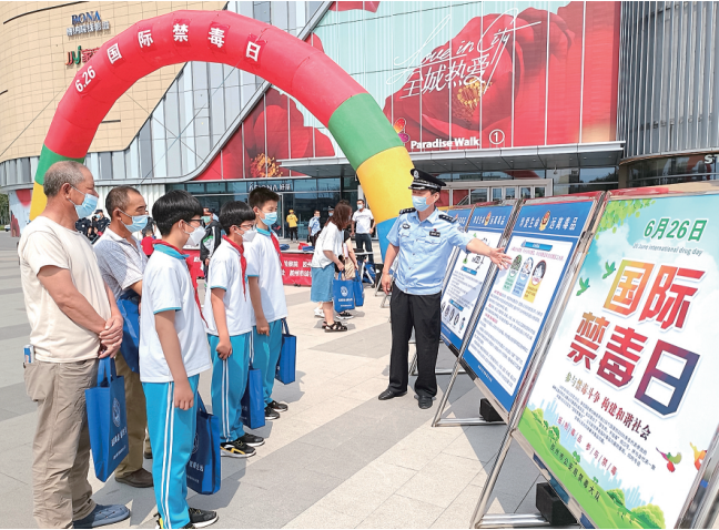 在“6·26”國際禁毒日即將來臨之際,6月11日,山東省膠州市委政法委、市人民法院、市人民檢察院、市教育和體育局、市公安局、市婦女聯(lián)合會、市公證處、市法學會等部門在膠州市龍湖天街廣場聯(lián)合開展禁毒宣傳活動,進一步推進禁毒宣傳,營造“社會群眾齊齊參與,禁毒知識人人知曉”的全民禁毒良好氛圍。圖為膠州市公安局禁毒大隊民警向群眾講解禁毒知識。