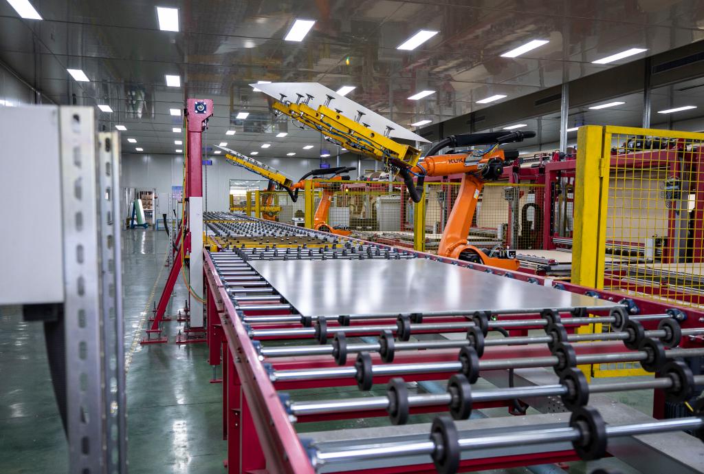 在寧夏金晶科技有限公司生產(chǎn)車間內(nèi),機械臂將成品光伏玻璃進行堆垛(6月1日攝)。新華社記者 楊植森 攝