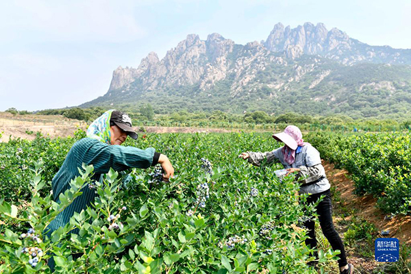 村民在山東省五蓮縣九五農業(yè)現(xiàn)代林果科技產業(yè)園采摘藍莓(2022年6月18日攝)。新華社記者 郭緒雷 攝